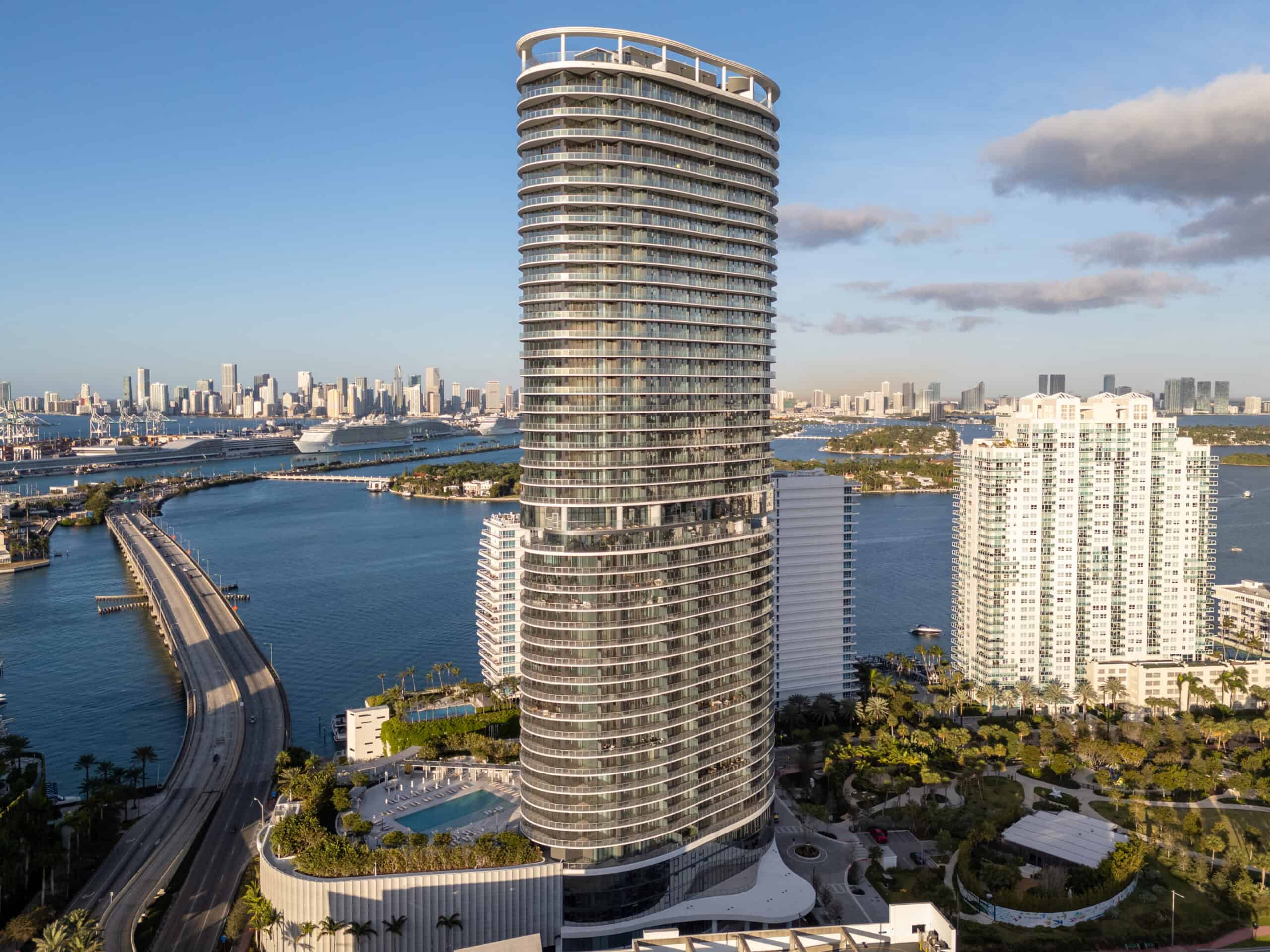 This project unites timeless glamour with a new, multidisciplinary approach to development. The site pairs a soaring residential building — the tallest in Miami Beach — with an expansive three acre public park, tasteful retail inclusion and the creation of an art-inspired bridge that connects the community south of fifth into a walkable wonderland surrounded by Florida’s pristine waters. In addition to coastal surrounds, an ever-blue bay and a carefully curated ecological park, Five Park offers a host of amenities that underscore the importance of living well and wellness itself. On-site work spaces, thoughtfully designed fitness areas, pools with sweeping views of Florida’s coastline, events and areas designated for families, and units designed to accommodate your every need invite you to embrace the transformative nature of a place like Five Park. Its sleek, curved design enhances natural light and maximizes outdoor living spaces. A Landmark in Miami Beach.